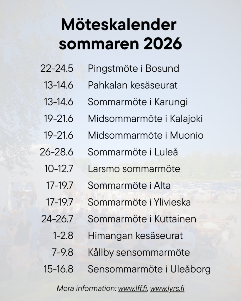 | Tvåspråkigt sommarmöte ordnas i Suvanto kapell (Renssulantie 12). Mera information: www.lyrs.fi. Varmt välkomna! | |
