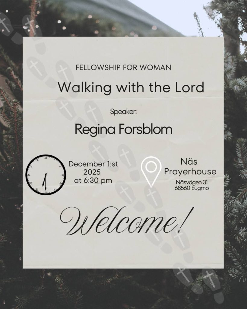 Home » Fellowship for woman 1.12 Fellowship for woman 1.12 Time 01.12.2025 at 18:30—21:00 Location Näs ChurchNäsvägen 31, Eugmo, Finland Description Theme: "Walking with the Lord" Speaker: Regina Forsblom