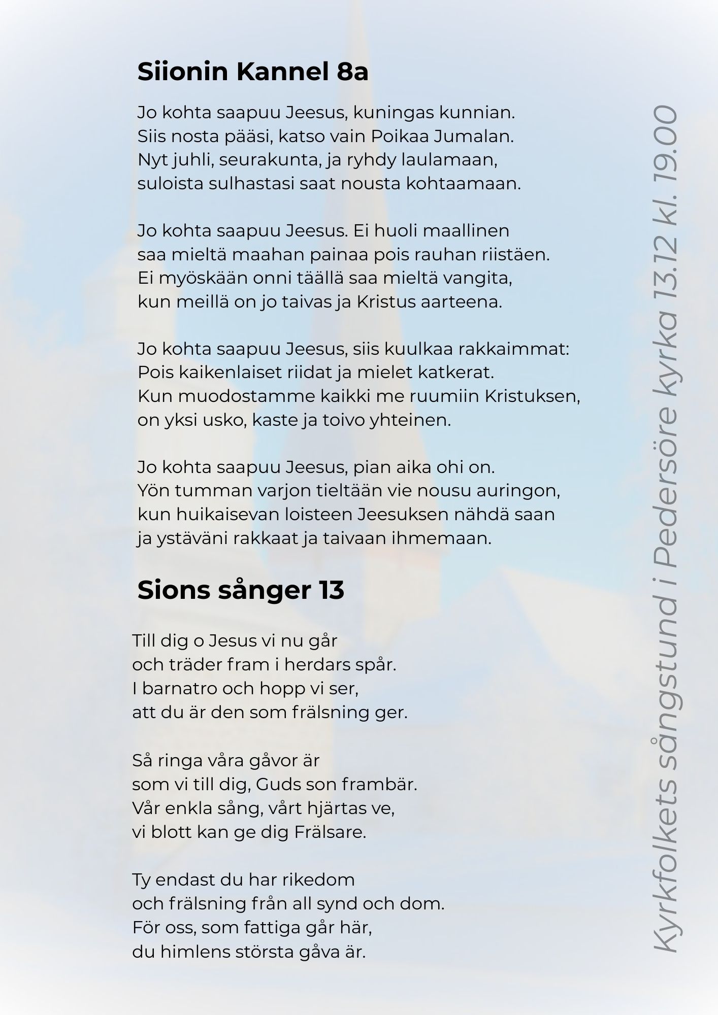 Kl. 19 Sångfest. Kören Adorate.. Andakt Martti Vähäkangas. Organist Nina Mård. Altarandakt Stig-Erik Enkvist.