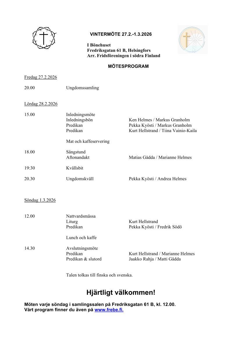 Hem » Evenemang » Vintermöte i Frebe 27.2-1.3 Vintermöte i Frebe 27.2-1.3 Time 27.02—01.03.2026 Location FrebeFredrikinkatu 61, Helsinki, Finland Description Vintermöte ordnas i Helsingfors 27.2-1.3.2026 Arrangör: Fridsföreningen i Södra Finland