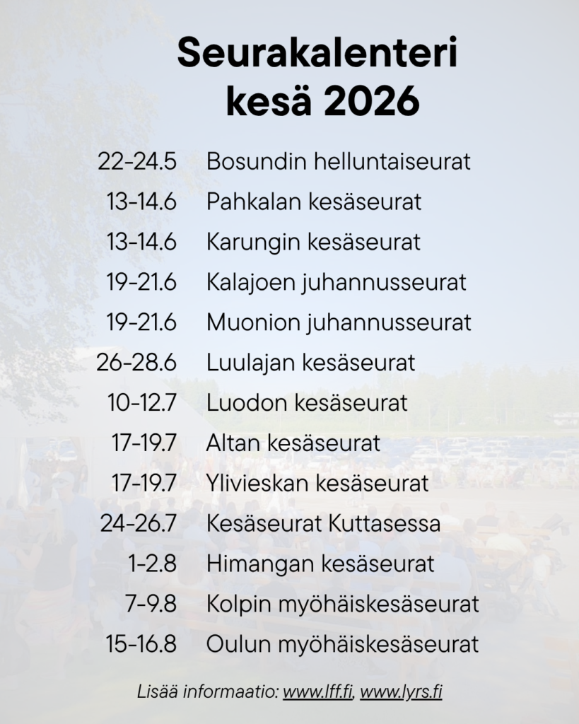 | Seurat alkavat lauantaina klo 17 ja sunnuntaina klo 10 jumalanpalveluksella Pahkalan seuratuvalla. Lisätietoa: https://lyrs.fi/tapahtumat/pahkalan-kesaseurat/ | |